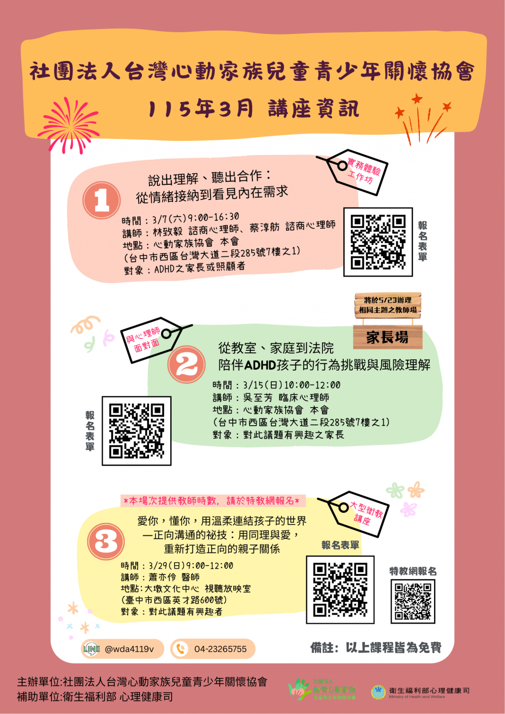 | 一、 | 本會長期關注注意力不足過動症(ADHD)兒童青少年之心理健康與人際適應議題,規劃辦理一系列免費之教師研習及家長教育活動。 |